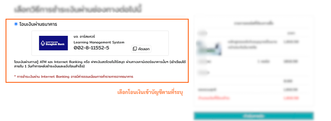 เลือกช่องทางในการชำระเงิน โดยคุณสามารถชำระค่าคอร์สออนไลน์ผ่านอนเงินเข้าบัญชีธนาคาร(กรุณาอ่านรายละเอียดก่อนเลือกช่องทางการชำระเงิน)